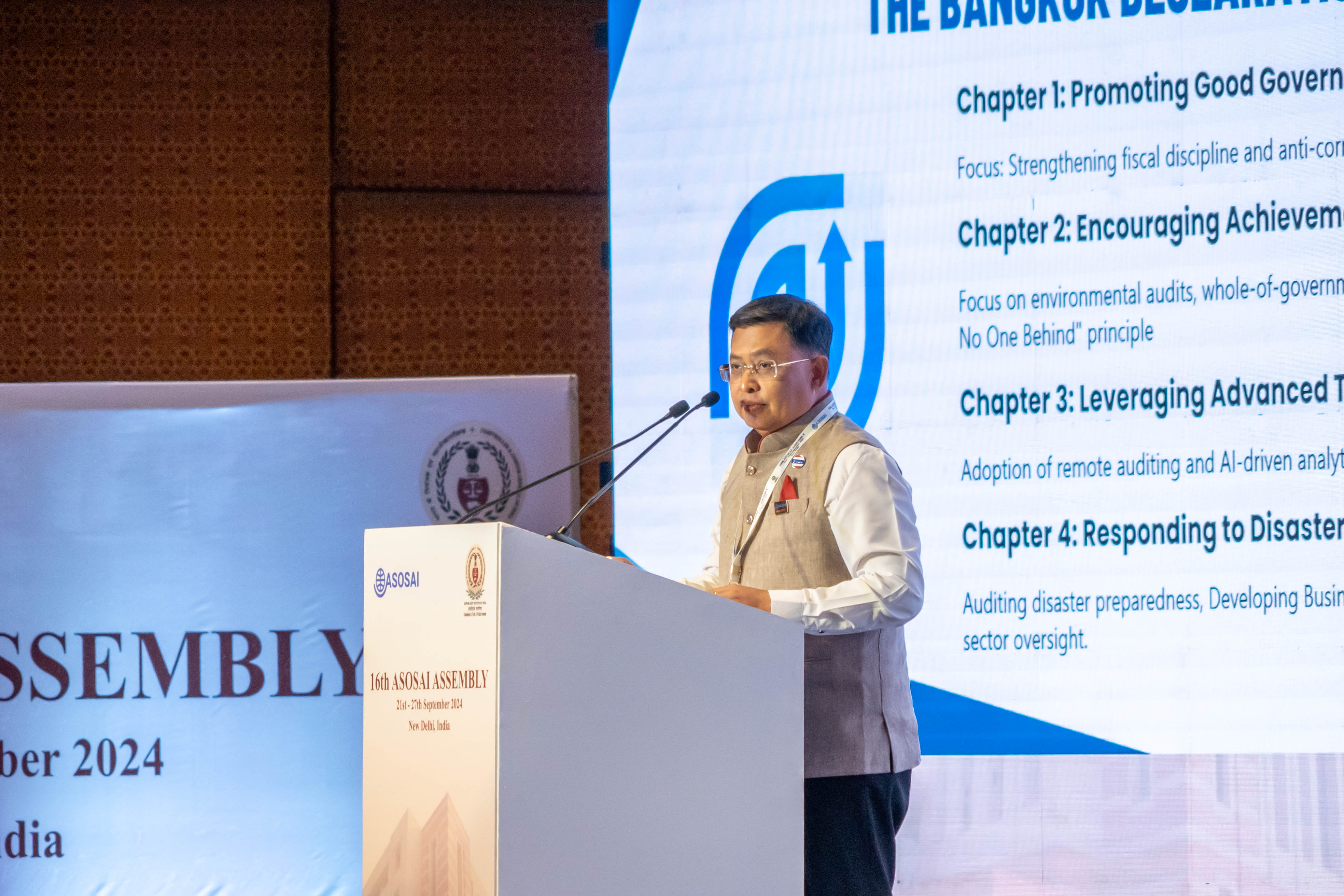 On September 24, the assembly was honored by the presence of Her Excellency Droupadi Murmu, President of India, who gave an opening speech. General Chanathap Indamra officially opened the 16th ASOSAI Assembly, underscoring the importance of SAIs adapting to the "Next Normal." During the 7th agenda, Mr. Monthien Charoenpol reported on the progress of the Bangkok Declaration, which focuses on four key areas: promoting good governance, achieving SDGs, leveraging advanced technologies like AI and remote audits, and responding to crises.