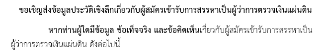 ขอเชิญส่งข้อมูลประวัติเชิงลึกเกี่ยวกับบุคคลผู้สมัครเพื่อเข้ารับการสรรหาเป็นผู้ว่าการตรวจเงินแผ่นดิน