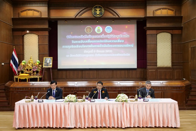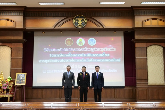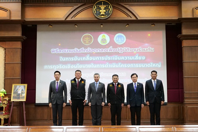วันที่ 5 มีนาคม 2568 สำนักงานการตรวจเงินแผ่นดิน (สตง.) โดยนายมณเฑียร เจริญผล ผู้ว่าการตรวจเงินแผ่นดิน ร่วมกับ สำนักงานคณะกรรมการป้องกันและปราบปรามการทุจริตแห่งชาติ (ป.ป.ช.) โดย นายสาโรจน์ พึงรำพรรณ เลขาธิการคณะกรรมการ ป.ป.ช. และสำนักงานคณะกรรมการป้องกันและปราบปรามการทุจริตในภาครัฐ (ป.ป.ท.) โดยนายภูมิวิศาล เกษมศุข เลขาธิการคณะกรรมการ ป.ป.ท. ได้จัด พิธีลงนามบันทึกข้อตกลงเพื่อปฏิบัติงานร่วมกันในการขับเคลื่อนการประเมินความเสี่ยงการทุจริตเชิงนโยบายในการดำเนินโครงการขนาดใหญ่ เพื่อเป็นการแสดงเจตนารมณ์ร่วมกันในการส่งเสริมธรรมาภิบาลขับเคลื่อนการประเมินความเสี่ยงการทุจริตเชิงนโยบายในการดำเนินโครงการขนาดใหญ่ และเฝ้าระวังการทุจริตในกระบวนการจัดซื้อจัดจ้างและการบริหารพัสดุภาครัฐ