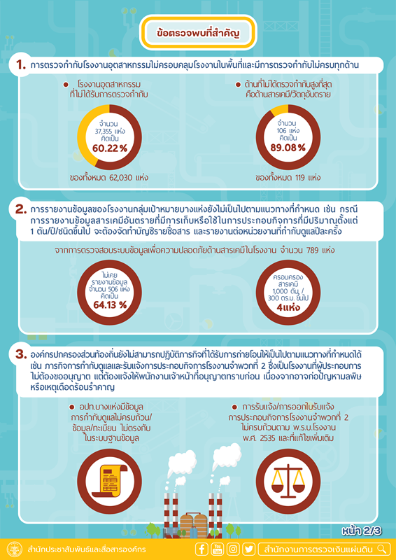 1. การตรวจกำกับโรงงานอุตสาหกรรมไม่ครอบคลุมโรงงานในพื้นที่และมีการตรวจกำกับไม่ครบ ทุกด้าน จากการตรวจสอบผลการดำเนินงานการตรวจกำกับโรงงานอุตสาหกรรม ซึ่งประกอบด้วย ข้อมูลโรงงาน ความปลอดภัยในโรงงาน เครื่องจักรอุปกรณ์ การควบคุมการปล่อยมลพิษ และการจัดการกากอุตสาหกรรม พบว่า การตรวจกำกับโรงงานอุตสาหกรรมไม่ครอบคลุมโรงงานในพื้นที่รับผิดชอบ กล่าวคือ มีโรงงานอุตสาหกรรมที่ไม่ได้รับการตรวจกำกับเป็นจำนวน 37,355 แห่ง หรือคิดเป็นร้อยละ 60.22 ของโรงงานทั้งหมด 62,030 แห่ง ที่แจ้งประกอบการ ในปี พ.ศ. 2565 ในขณะเดียวกัน จากการเข้าสังเกตการณ์โรงงานในส่วนภูมิภาค จำนวน 14 แห่ง ที่มีการร้องเรียนจากประชาชน ซึ่งในจำนวนนี้เป็นโรงงานที่ได้รับการตรวจกำกับแล้วจำนวน 13 แห่ง ปรากฏว่ามีโรงงานจำนวน 8 แห่ง ที่ประชาชนในพื้นที่โดยรอบโรงงานอุตสาหกรรมยังคงได้รับผลกระทบจากการส่งกลิ่นเหม็นฝุ่นและมลพิษทางอากาศ เป็นต้น นอกจากนี้ ยังพบว่ามีการตรวจกำกับโรงงานอุตสาหกรรมไม่ครบทุกด้าน โดยด้านที่ไม่ได้ตรวจกำกับสูงที่สุดคือด้านสารเคมี/วัตถุอันตราย มีจำนวนทั้งสิ้น 106 แห่ง หรือคิดเป็นร้อยละ 89.08 ของโรงงานที่มีสารเคมี/วัตถุอันตรายทั้งหมด 119 แห่ง