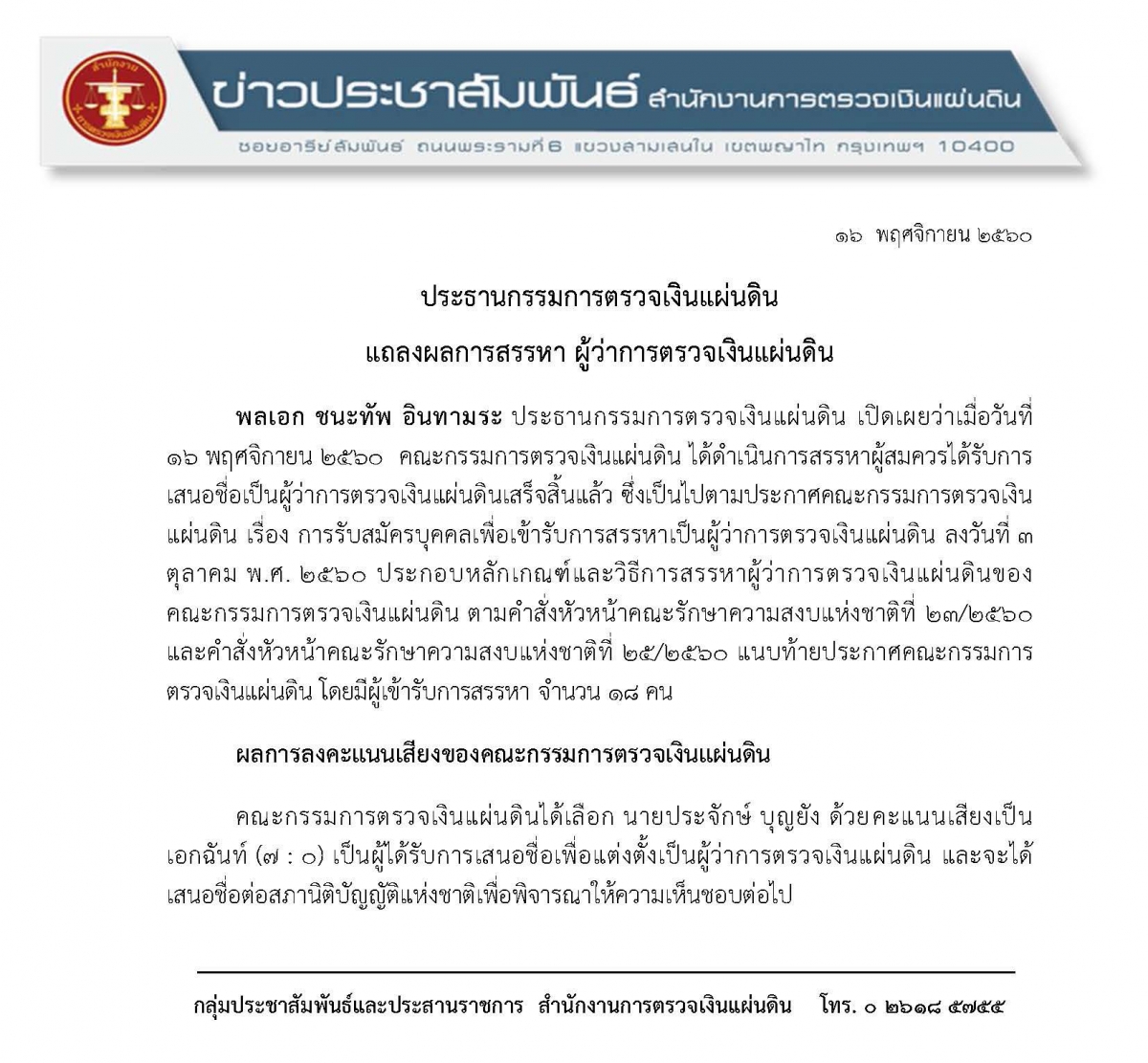 ผลการสรรหาผู้ว่าการตรวจเงินแผ่นดิน