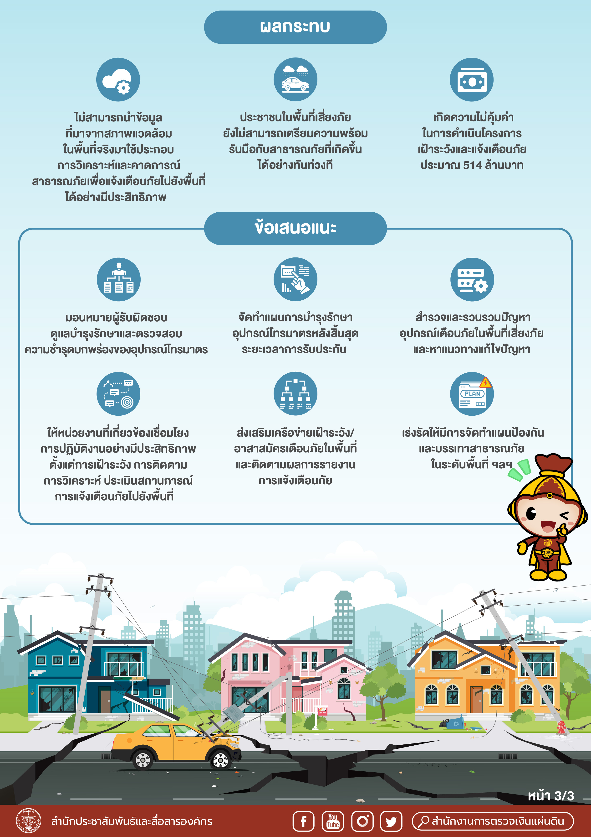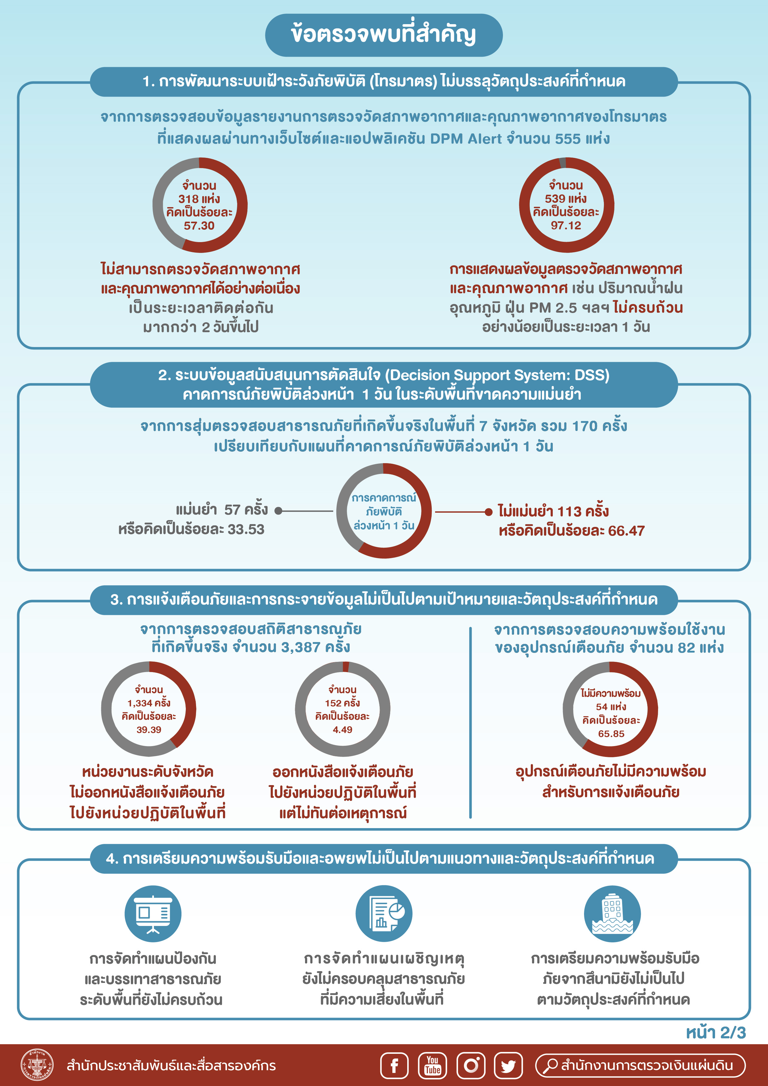 infographic สตง.ร่วมเฝ้าระวัง ระบบเตือนสาธารณภัย เผยผลการตรวจสอบและข้อเสนอแนะ เพื่อเตรียมพร้อมรับมือสถานการณ์ภัยพิบัติ